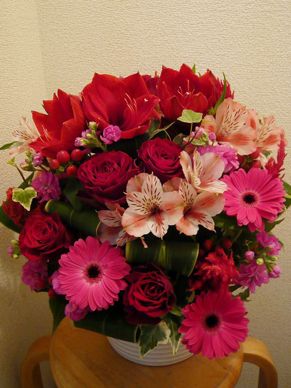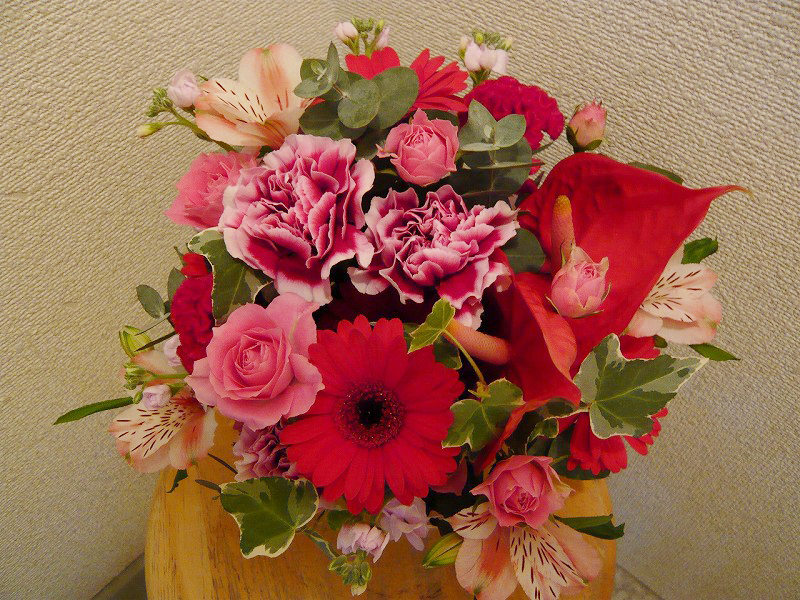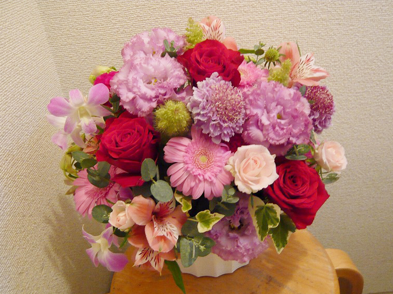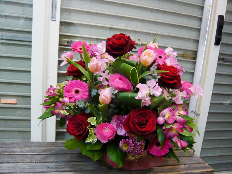 | 色あざやかで元気いっぱいの花々 | ピンクを基調に真っ赤なバラでアクセントを |