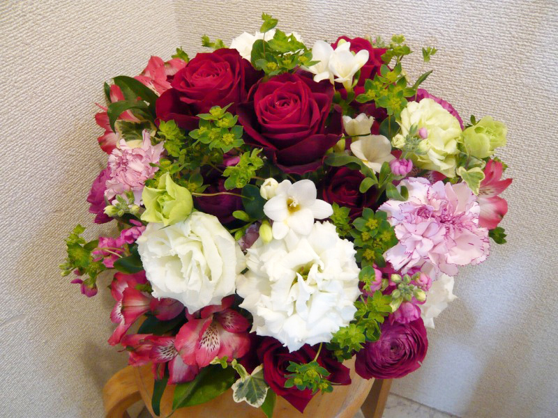 | お誕生日のお祝いに真っ赤な花々のプレゼント | ピンクを白を基調に清楚な花束 |