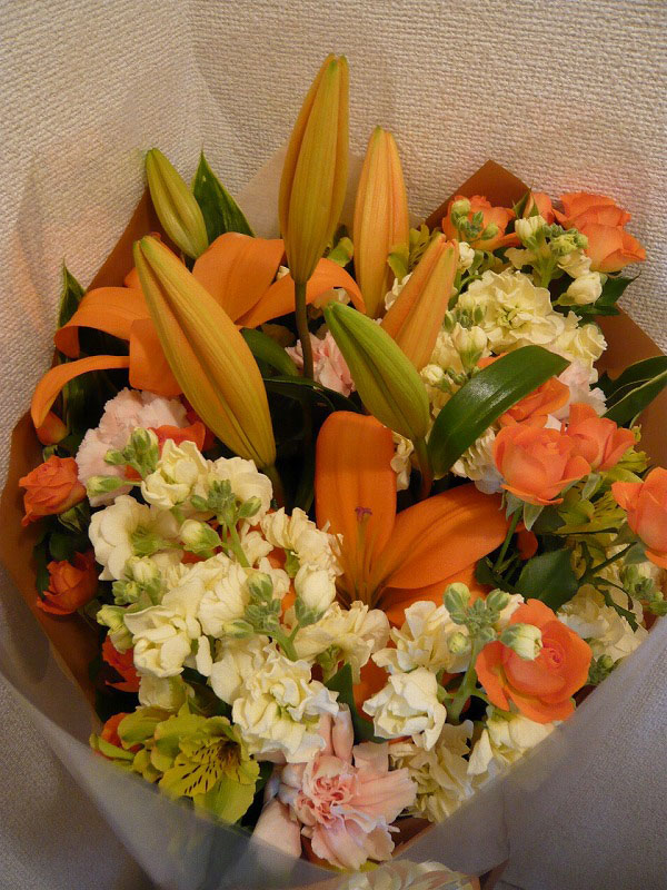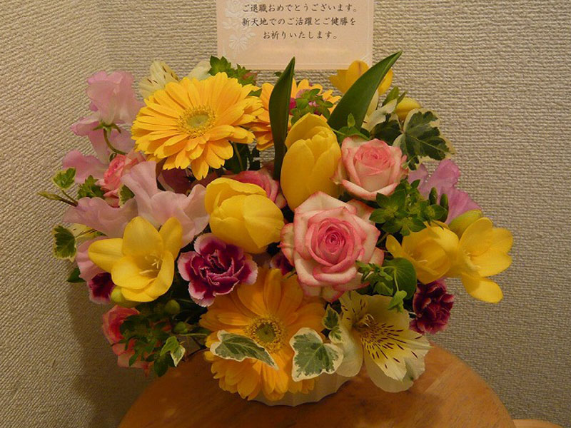 | 色鮮やかに元気いっぱいの花束を | お祝いの言葉に添えるたくさんの花々 |