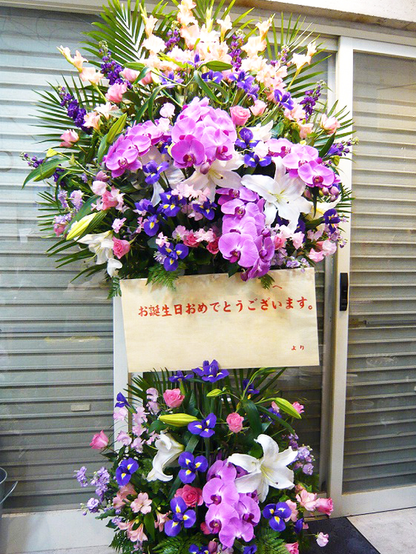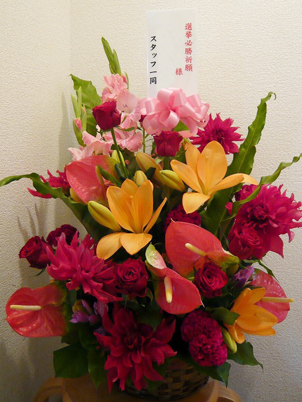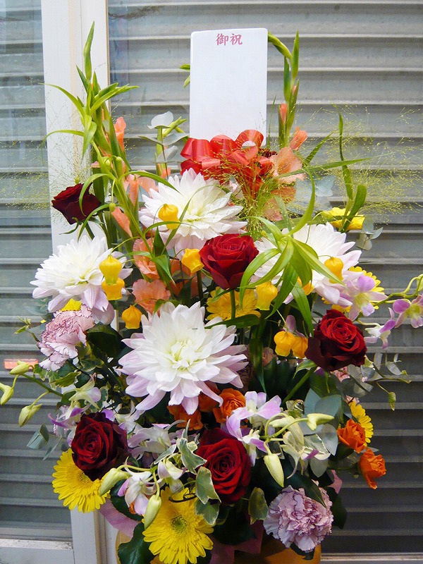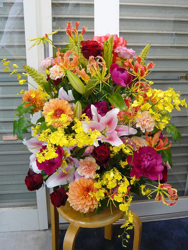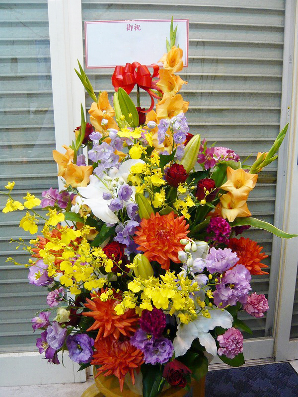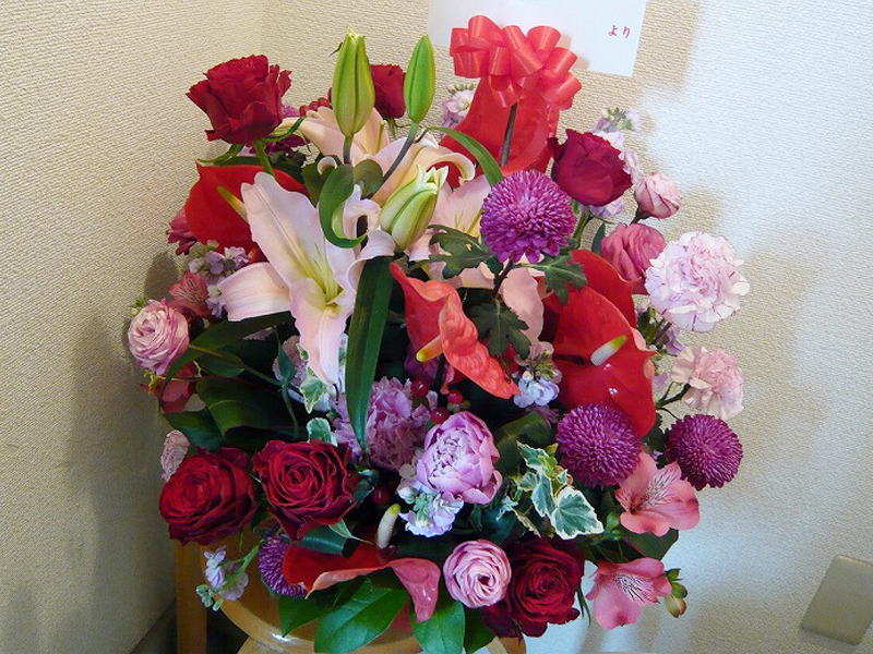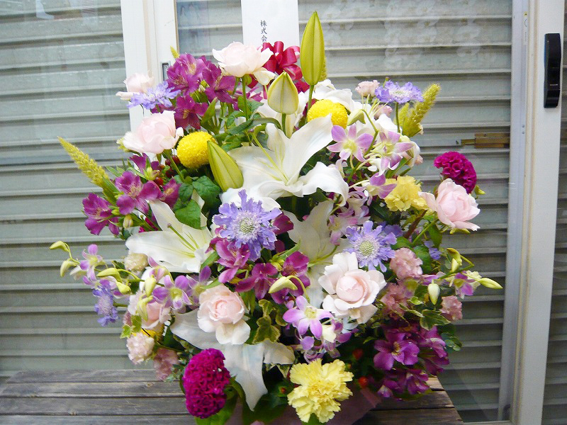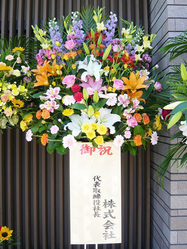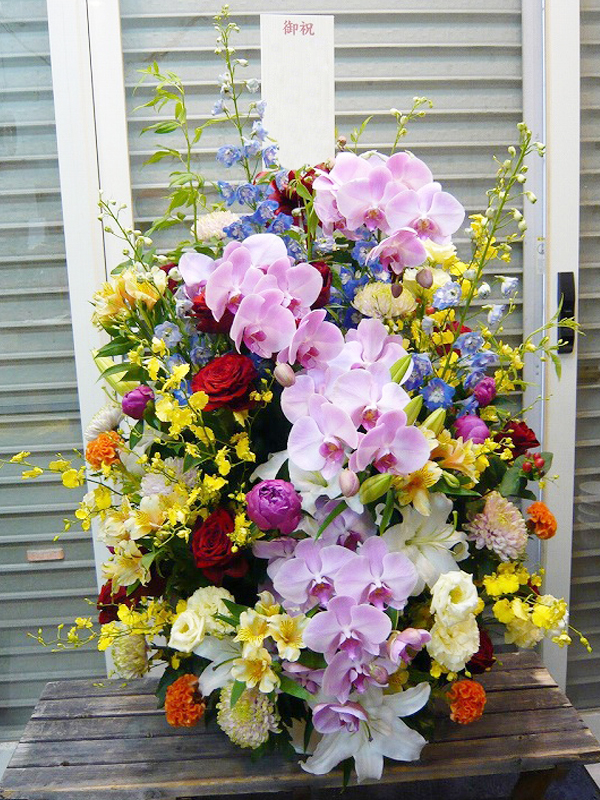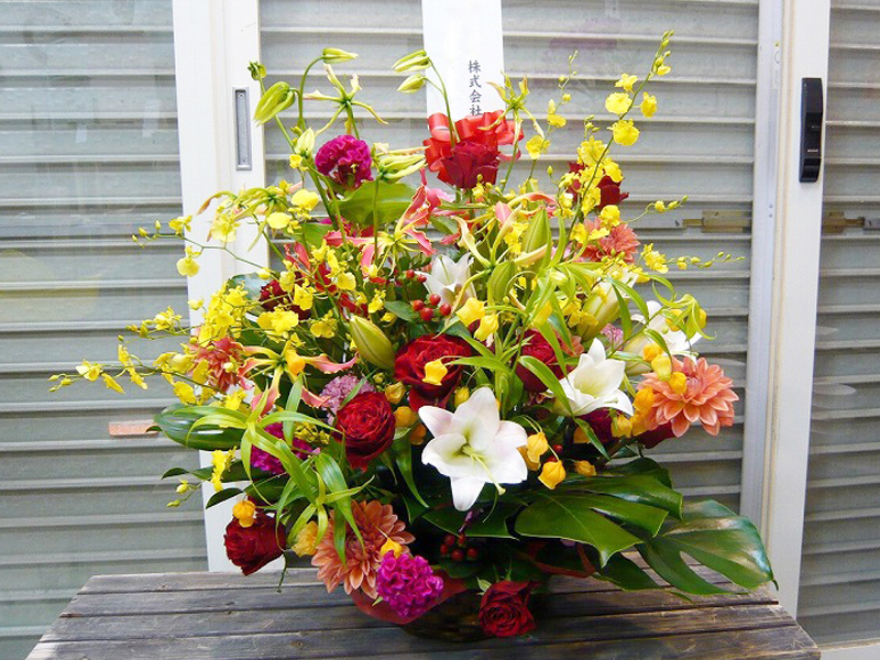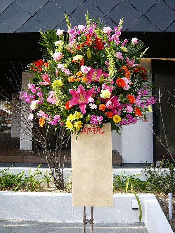 | お祝い事にピッタリの賑やかなスタンド花 | 喜ぶ顔を浮かべながら美しい花を贈ります |