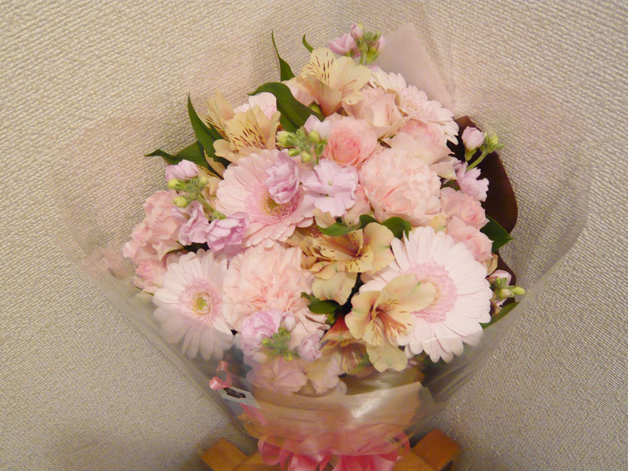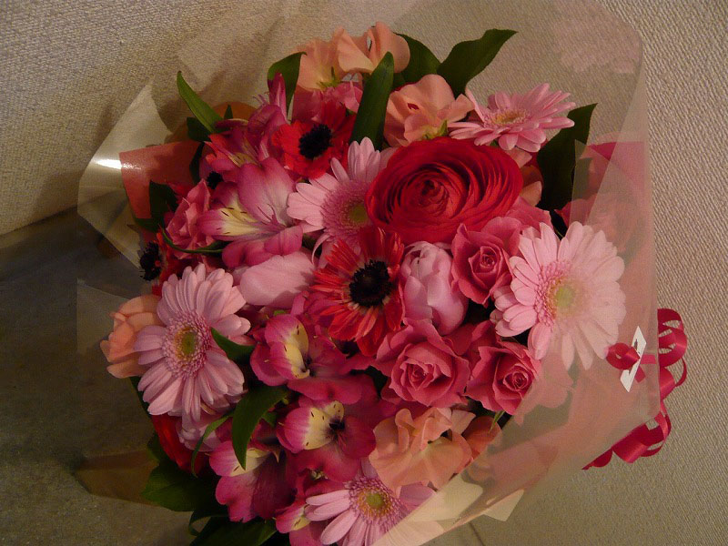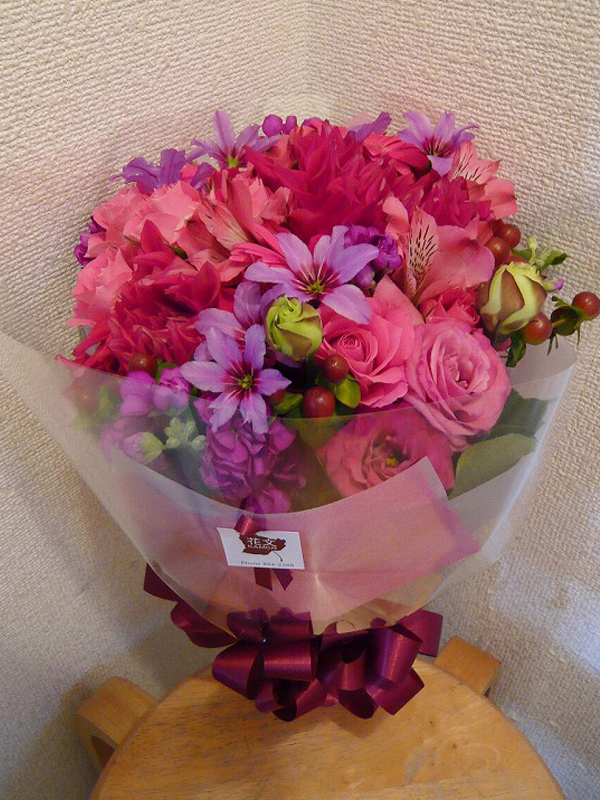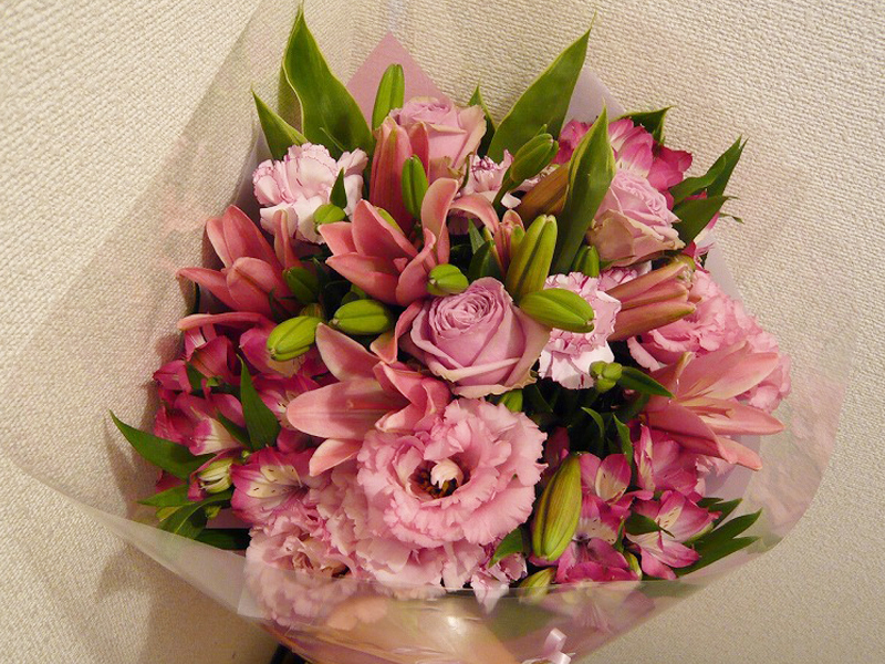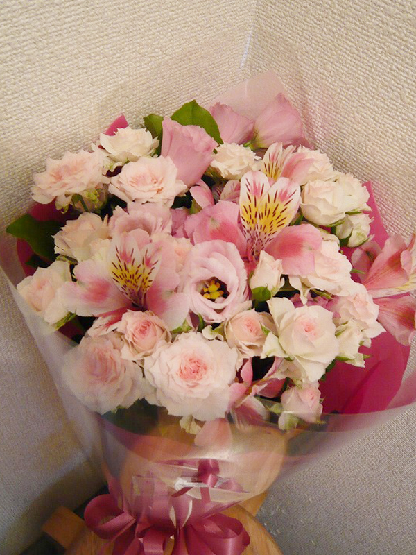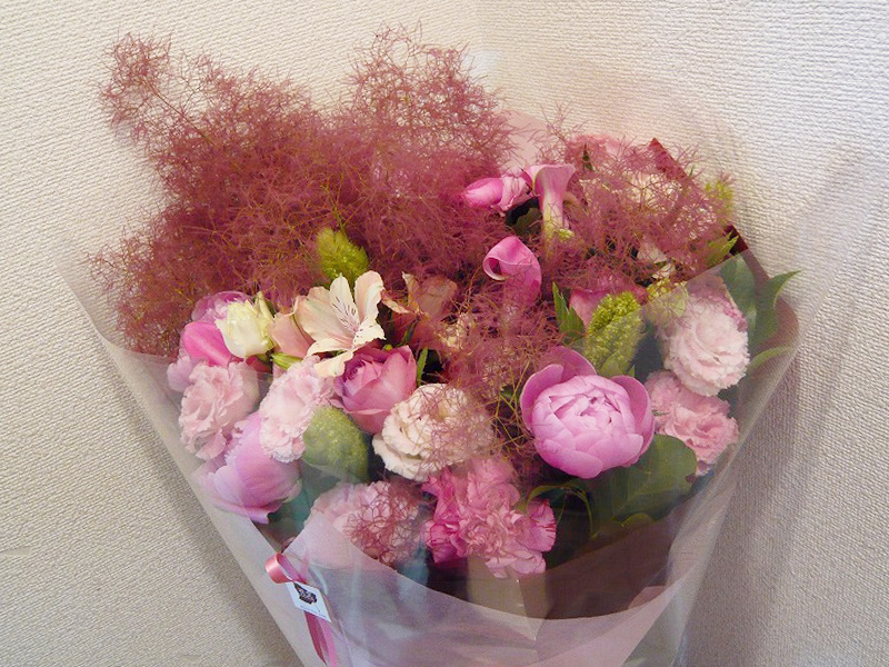 | 春らしいピンクを基調とした鮮やかな花束 | 喜ぶ顔を浮かべながら美しい花を贈ります |