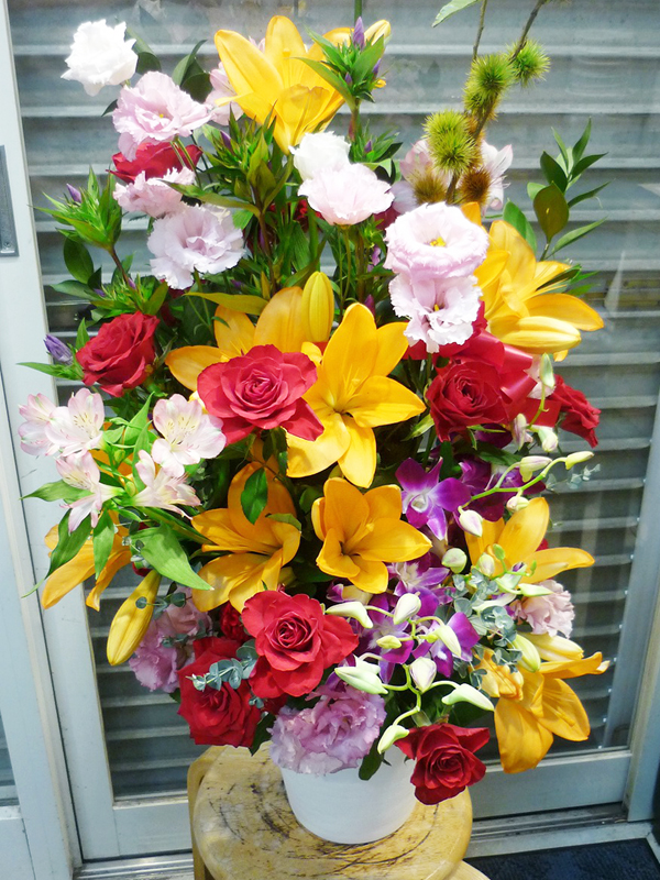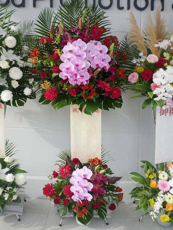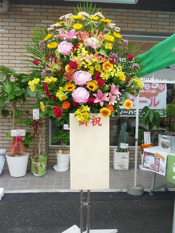| 開店のお祝いに、美しいお花とお祝いの気持ちを込めて。 | 色とりどりの花のスタンドでお祝いの気持ちを。 |