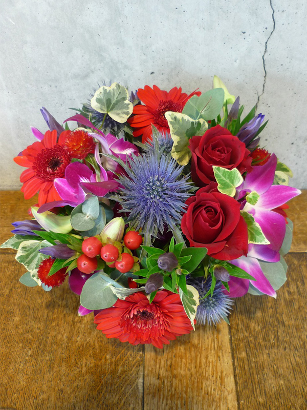 | 鮮やかな色の花々で空間を華やかに彩ります。 | シックな印象のある色使いは、飾る場所を選びません。 |
