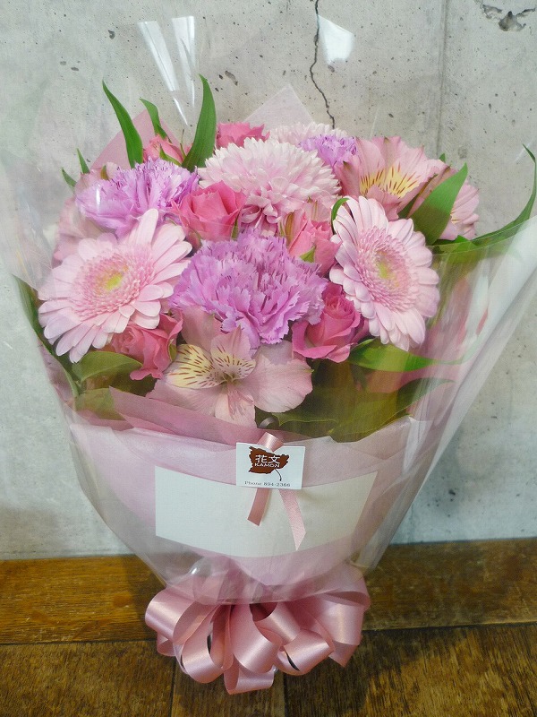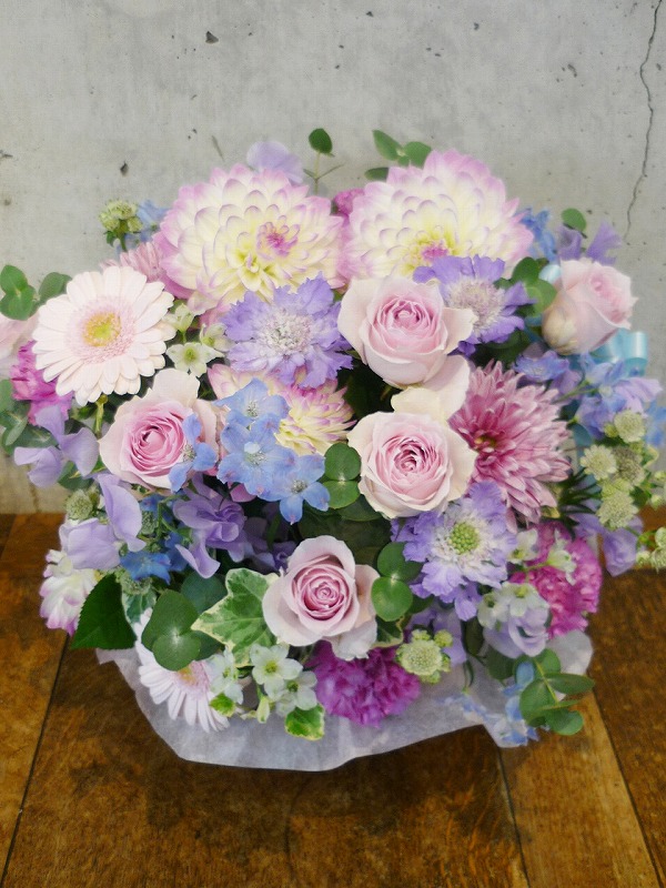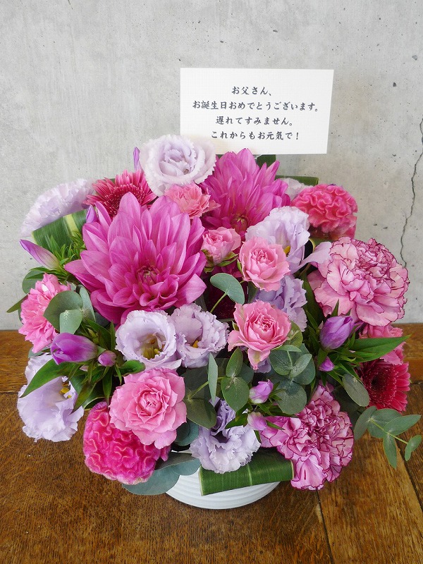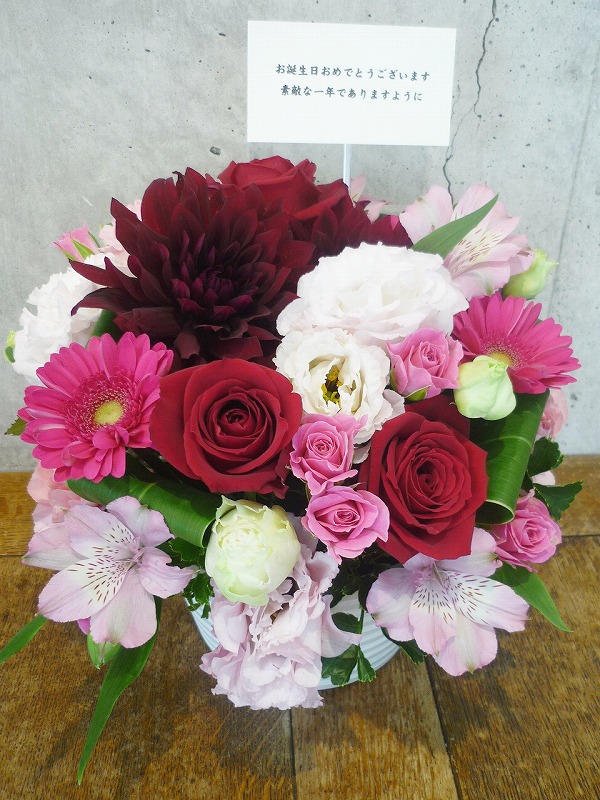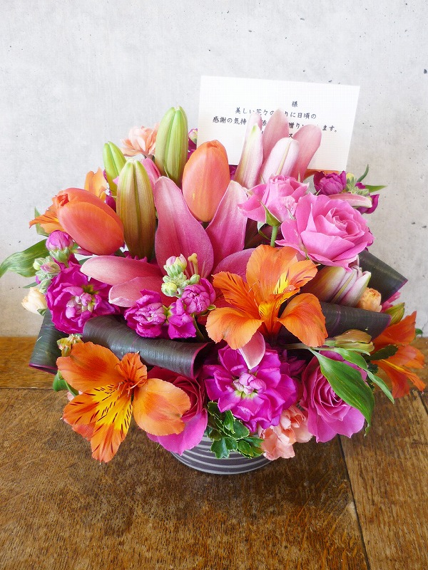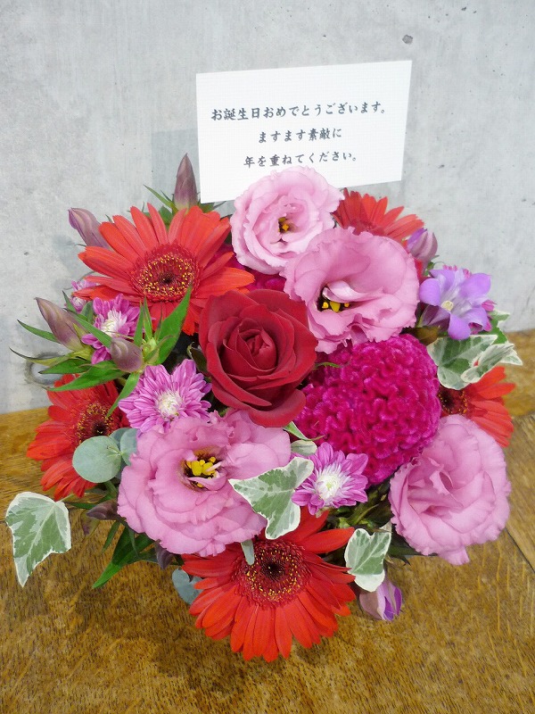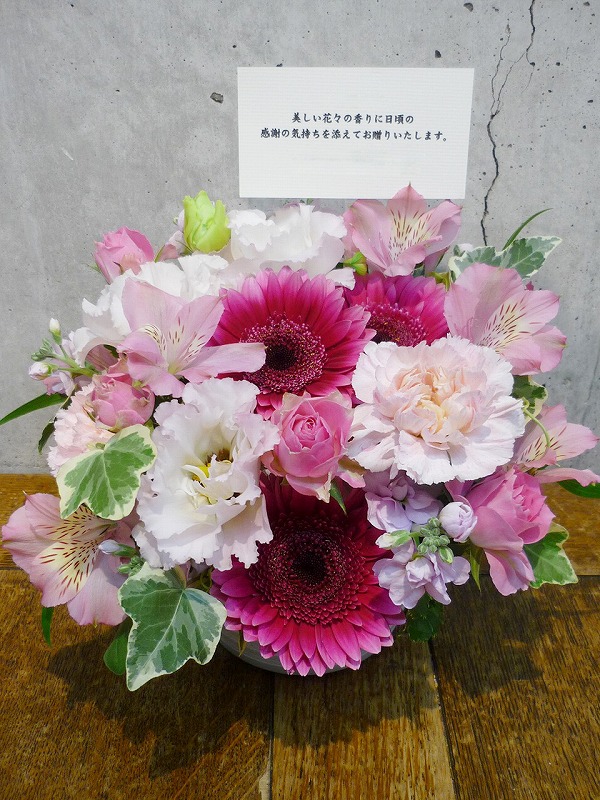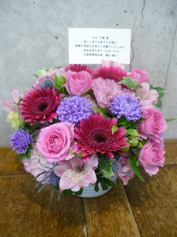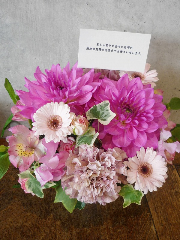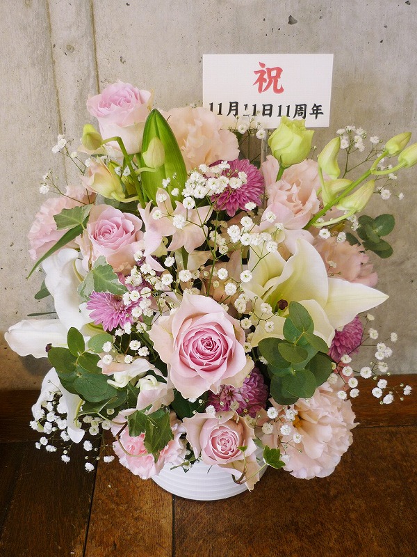 | 可愛らしいピンクのグラデーションでお祝いを。 | 秋らしい色合いの花々を周年のお祝いに。 |