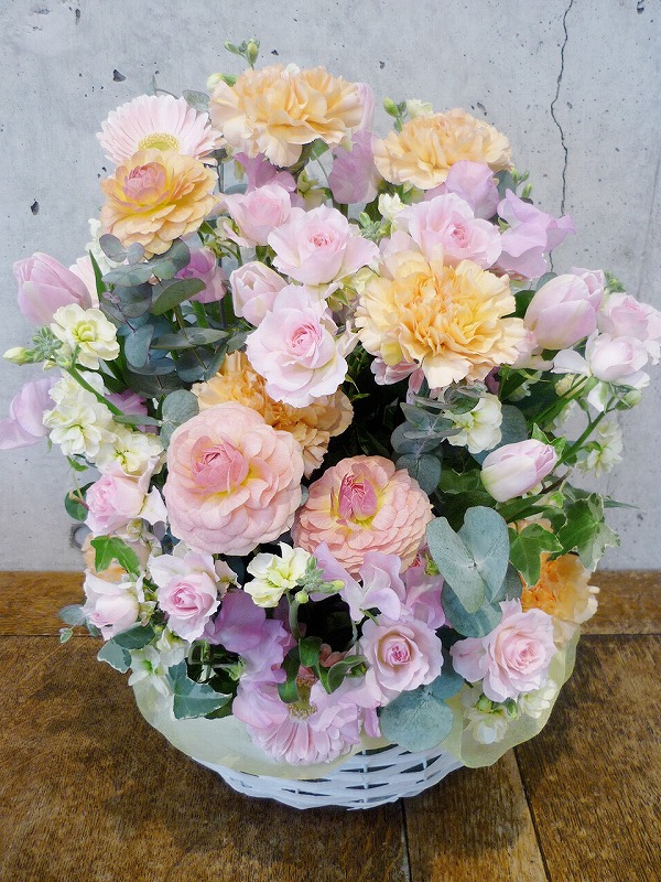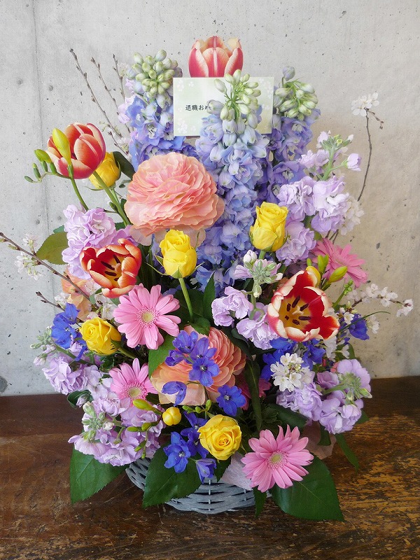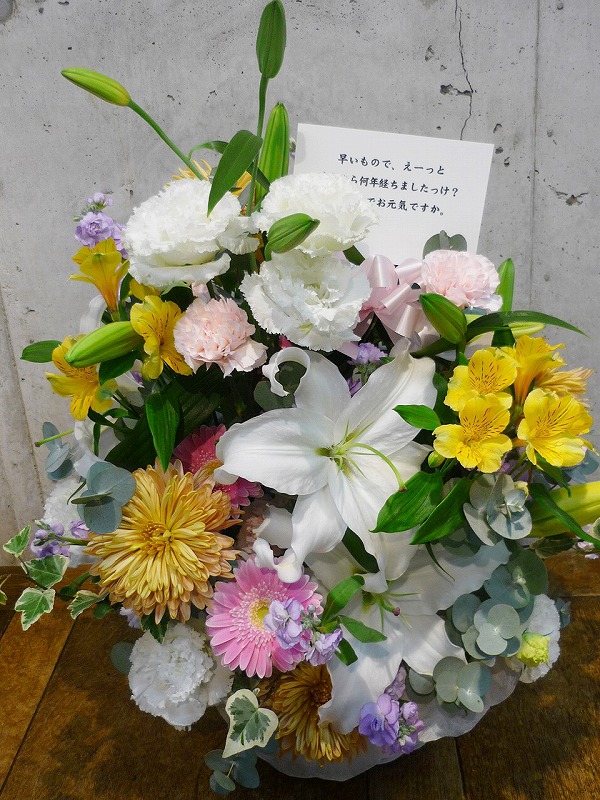 | お相手のイメージに合わせてお作りいたします。 | お祝いの言葉と共に、たくさんの花々を。 |