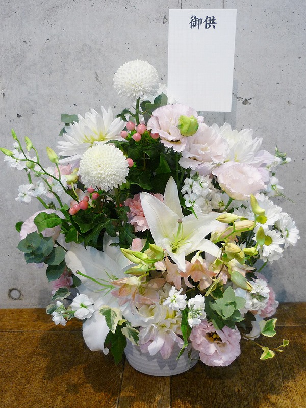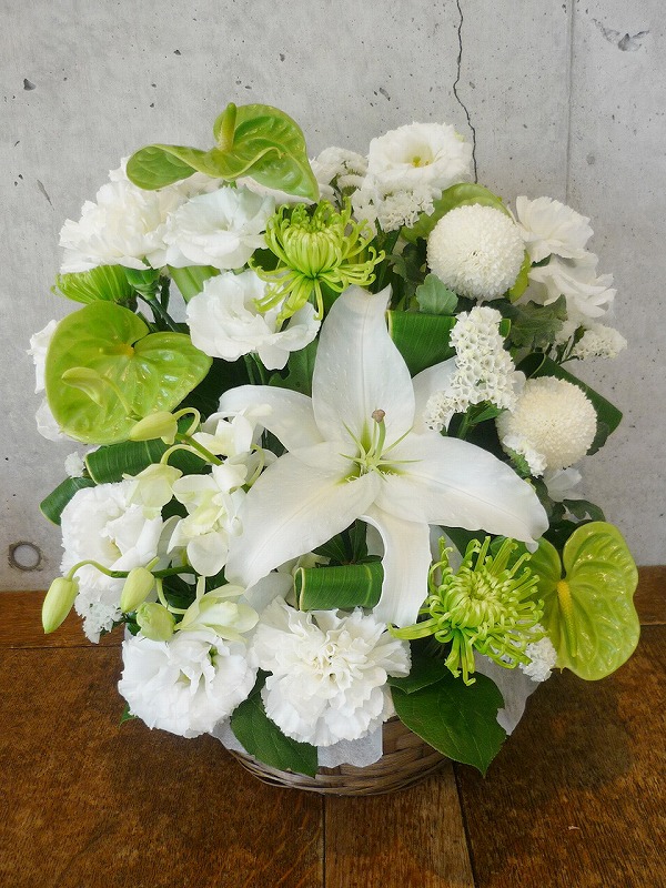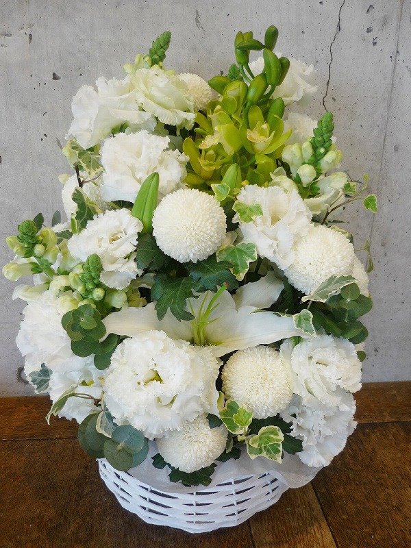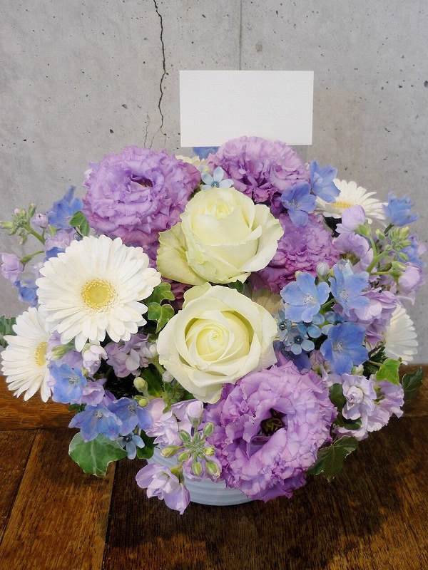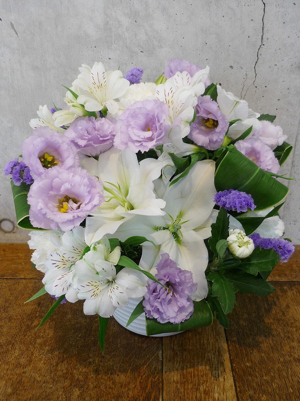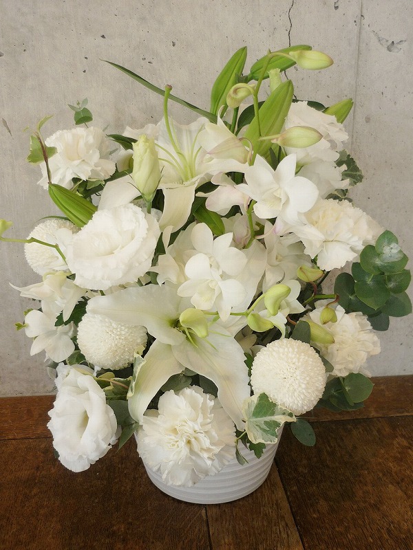 | シックな印象のある色使いは、飾る場所を選びません。 | 品のある清楚な白い花々で故人を偲んで。 |