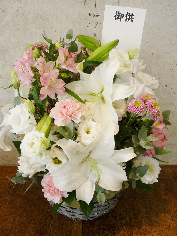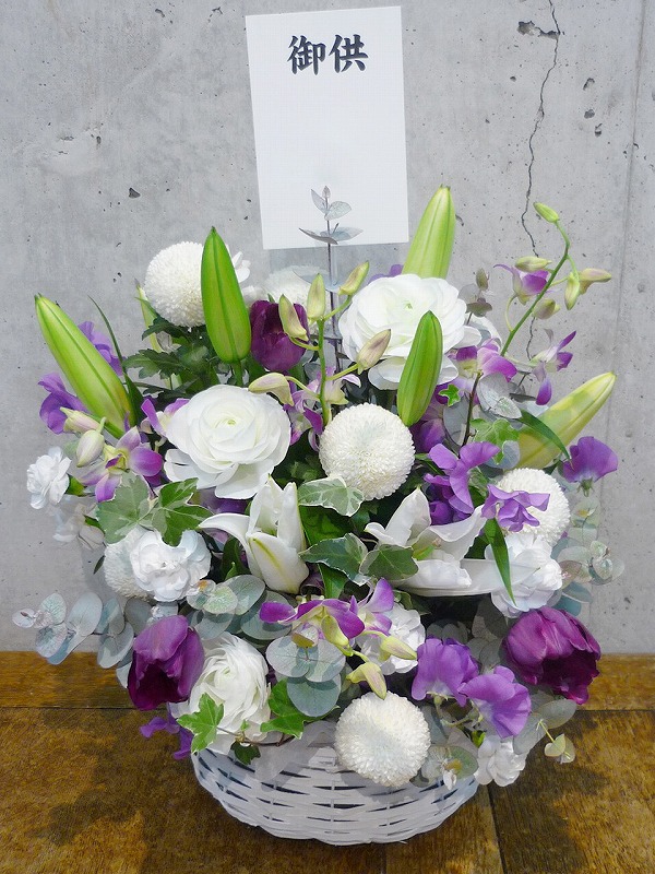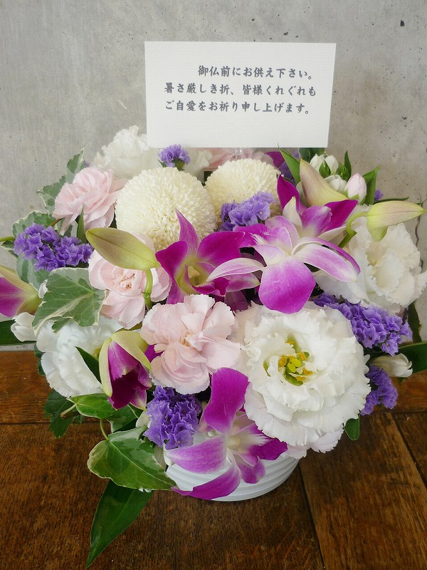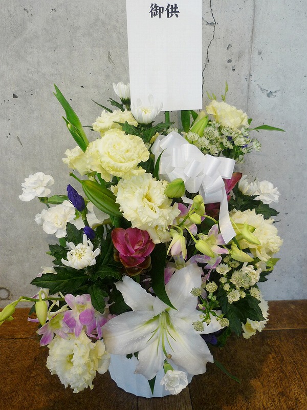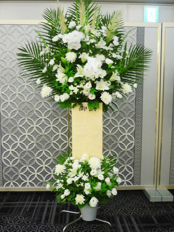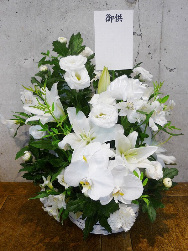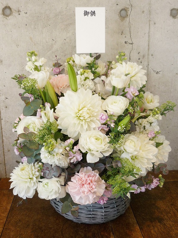 | シックな印象のある色使いは、飾る場所を選びません。 | 品のある清楚な白い花々で故人を偲んで。 |