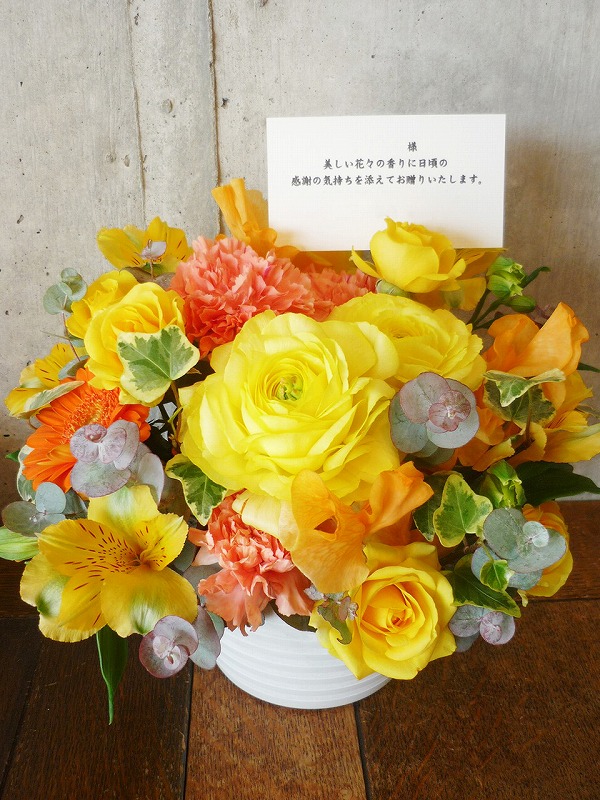 | プレゼントする人の雰囲気に合わせた明るい花々。 | 日頃の感謝の気持ちをたくさんの花々に込めて。 |