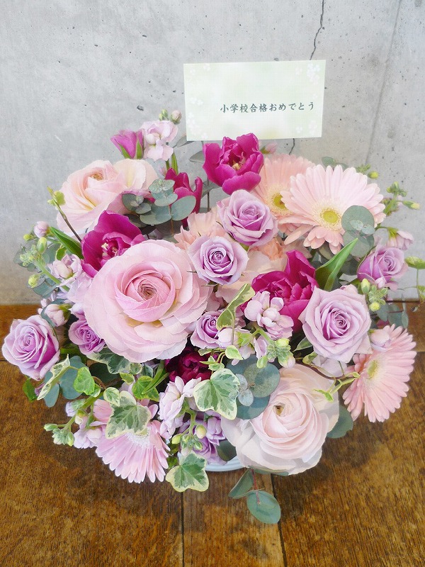 | お子様の進学のお祝いに贈る、大人っぽいアレンジ。 | ボリュームがあって、豪勢なアレンジでお祝いを。 |
