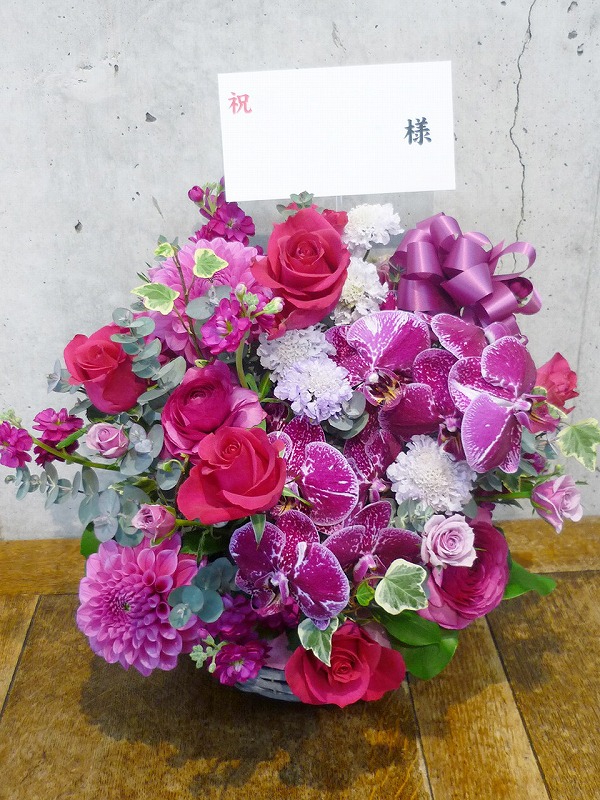 | 送る方の雰囲気に合わせた、シックな色の花々。 | ボリュームがあって、豪勢なアレンジでお祝いを。 |