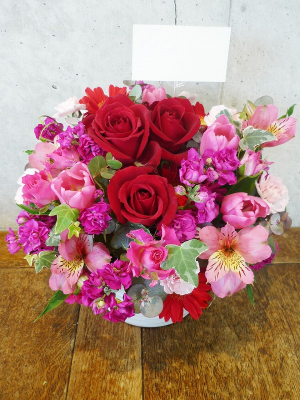 | 鮮やかな色の花々で空間を華やかに彩ります。 | 情熱的な赤とキュートなピンクで色鮮やかなアレンジ。 |