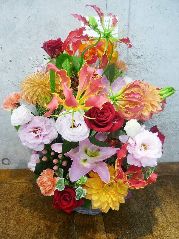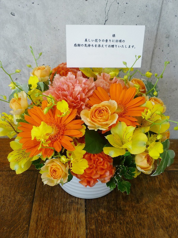 | 鮮やかな色の花々で空間を華やかに彩ります。 | 日頃の感謝の気持ちをたくさんの花々に込めて。 |
