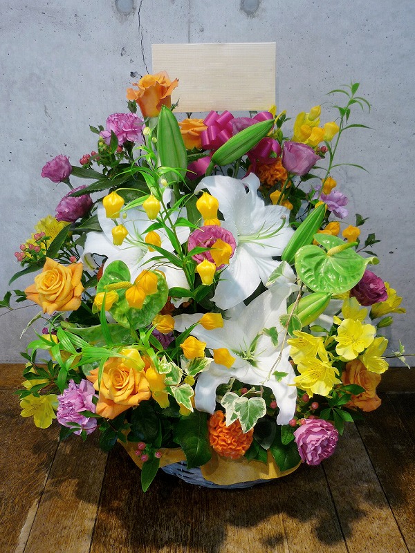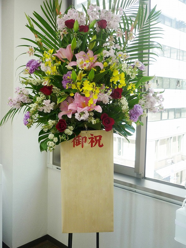 | 華やかにその場を彩る豪華なフラワースタンド。 | 色とりどりの花のスタンドでお祝いの気持ちを。 |