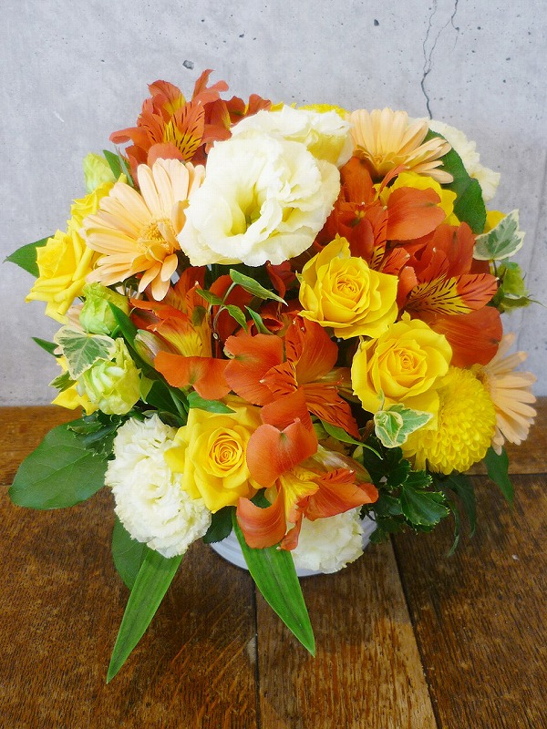 | 鮮やかな色の花々で空間を華やかに彩ります。 | シックな印象のある色使いは、飾る場所を選びません。 |