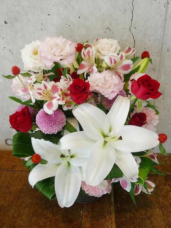 | シックな印象のある色使いは、飾る場所を選びません。 | ボリュームがあって豪勢なアレンジをお祝いに。 |