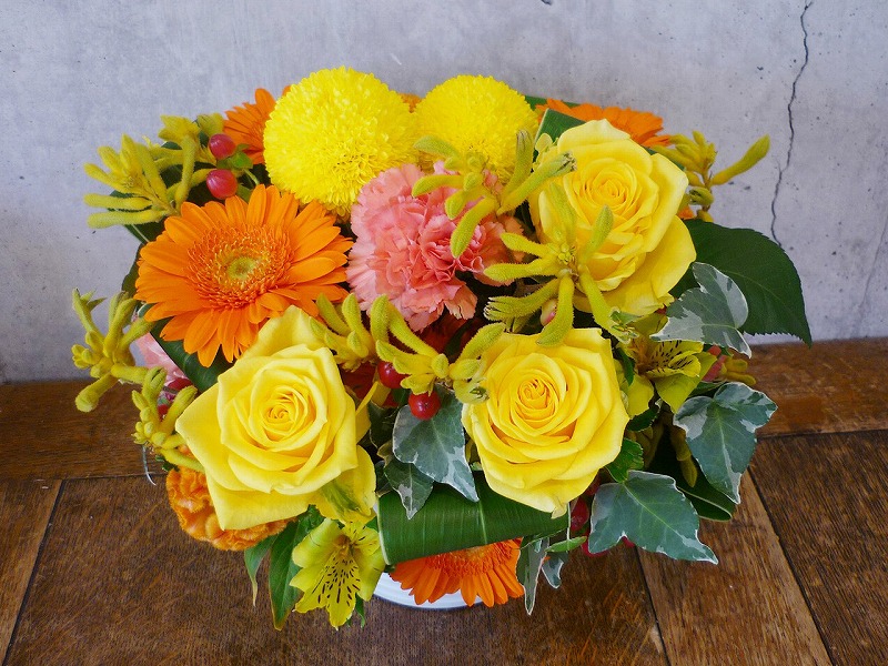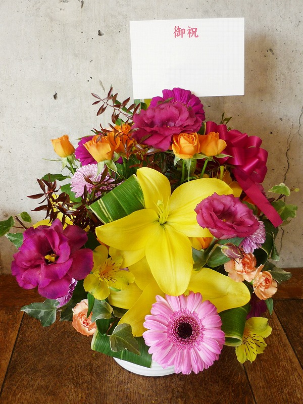 | プレゼントする人の雰囲気に合わせた明るい花々。 | ボリュームがあって豪勢なアレンジをお祝いに。 |