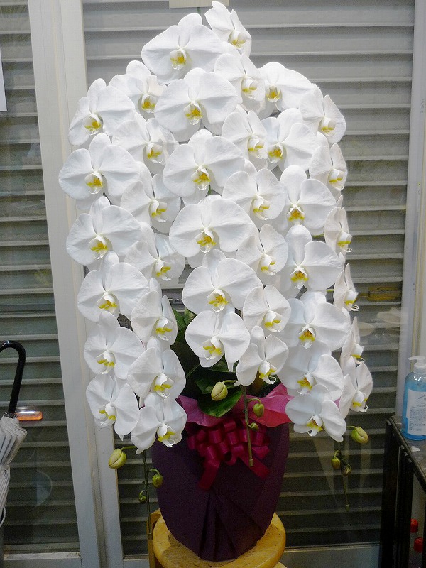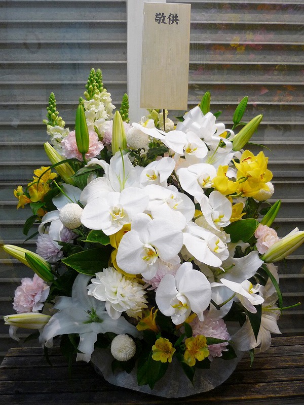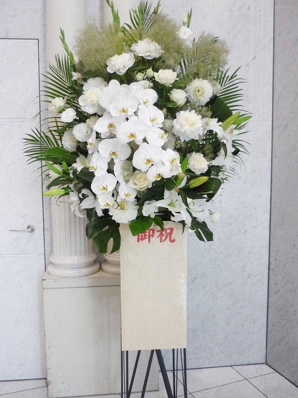 | ピンク色の蘭はシンビジューム。花言葉は「上品な女性」。 | 華やかにその場を彩る豪華なフラワースタンド。 |