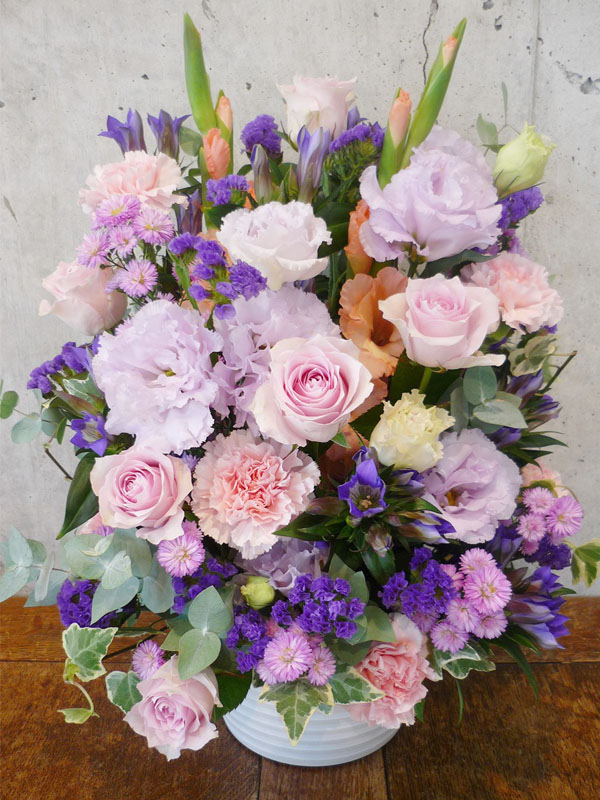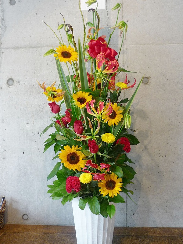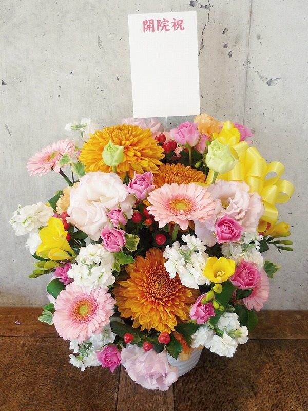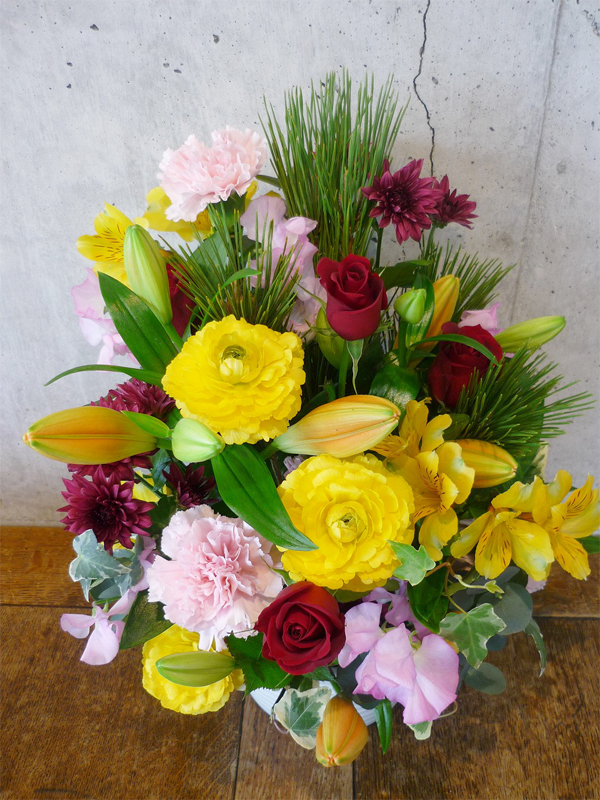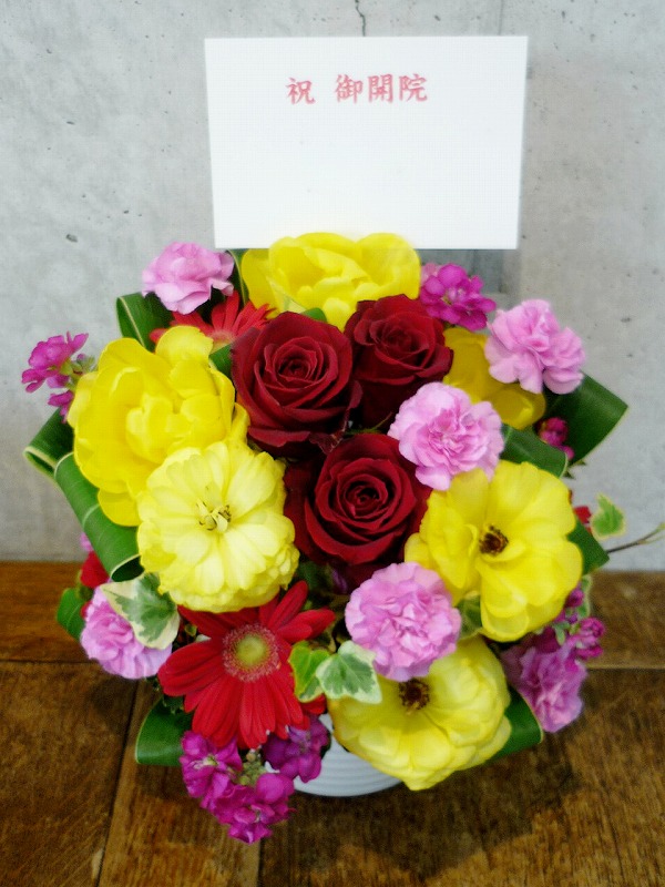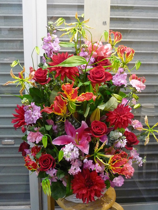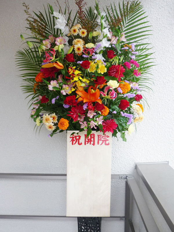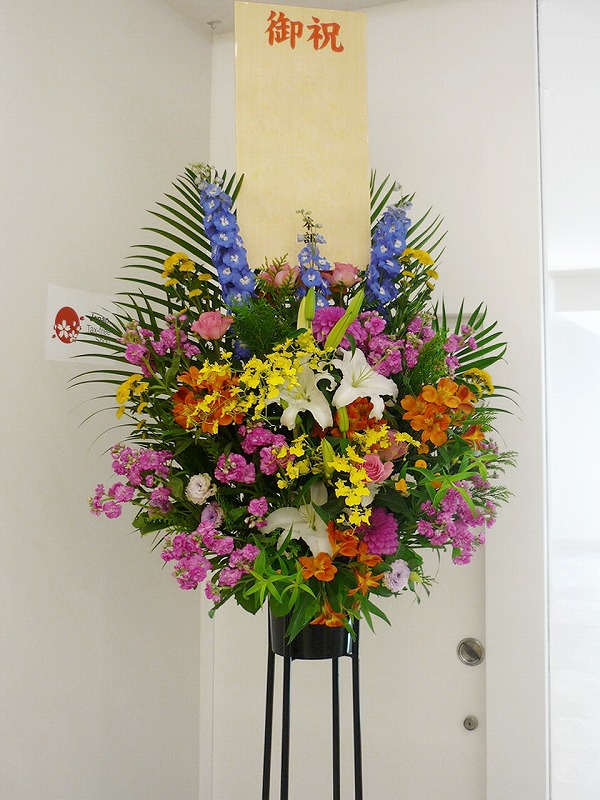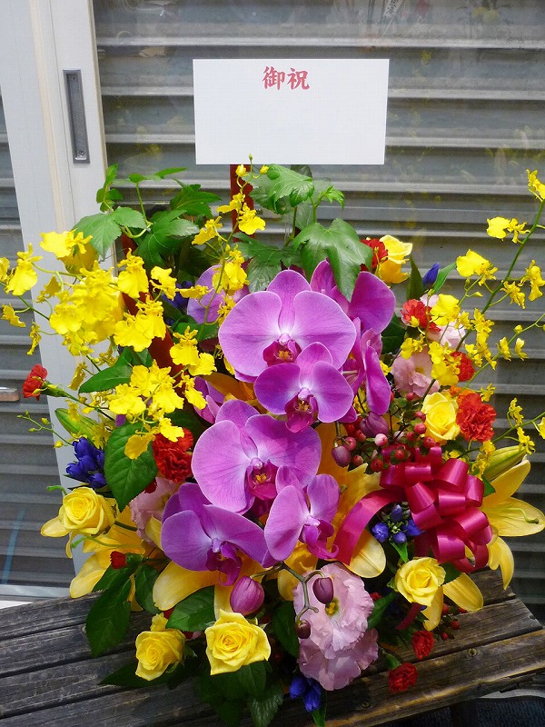 | ボリュームがあって豪勢なアレンジをお祝いに。 | 色とりどりの花のスタンドでお祝いの気持ちを。 |