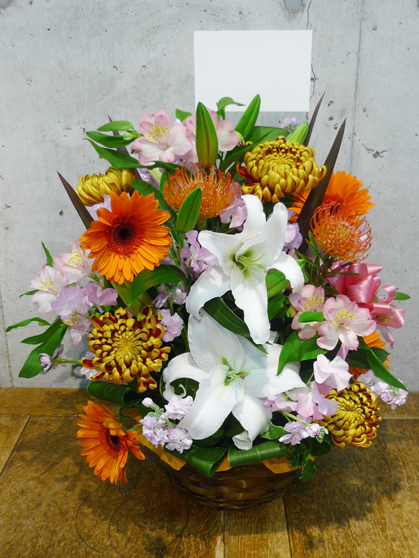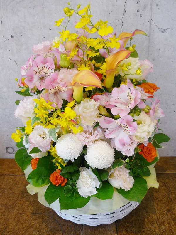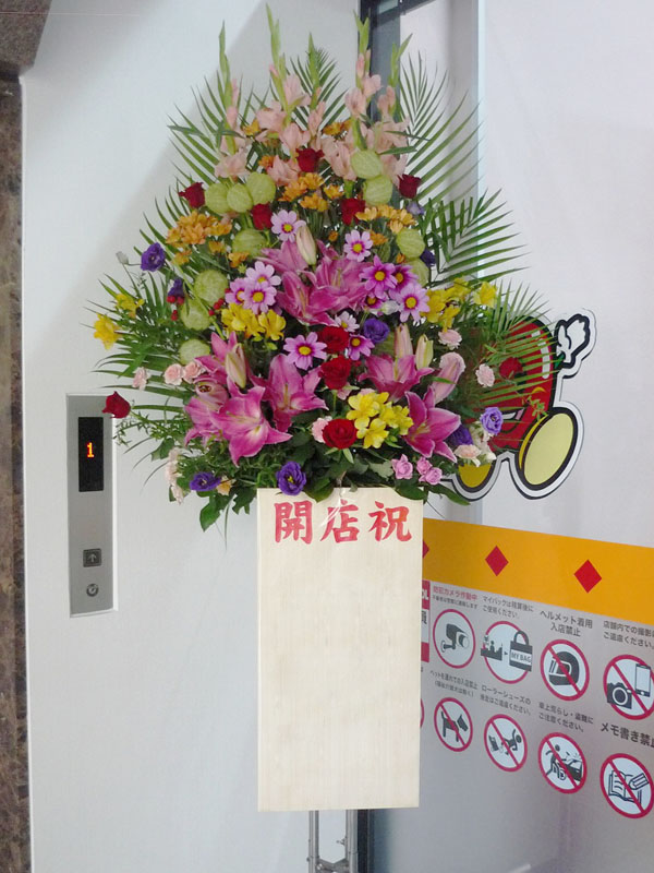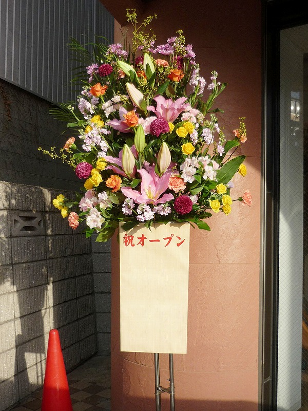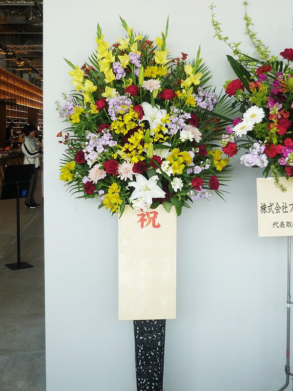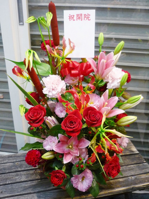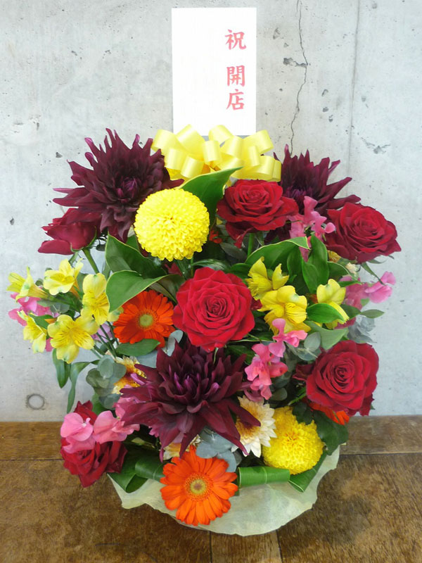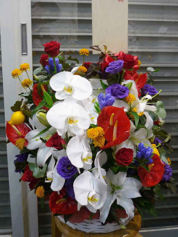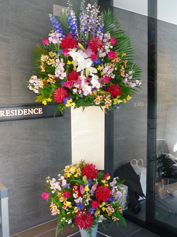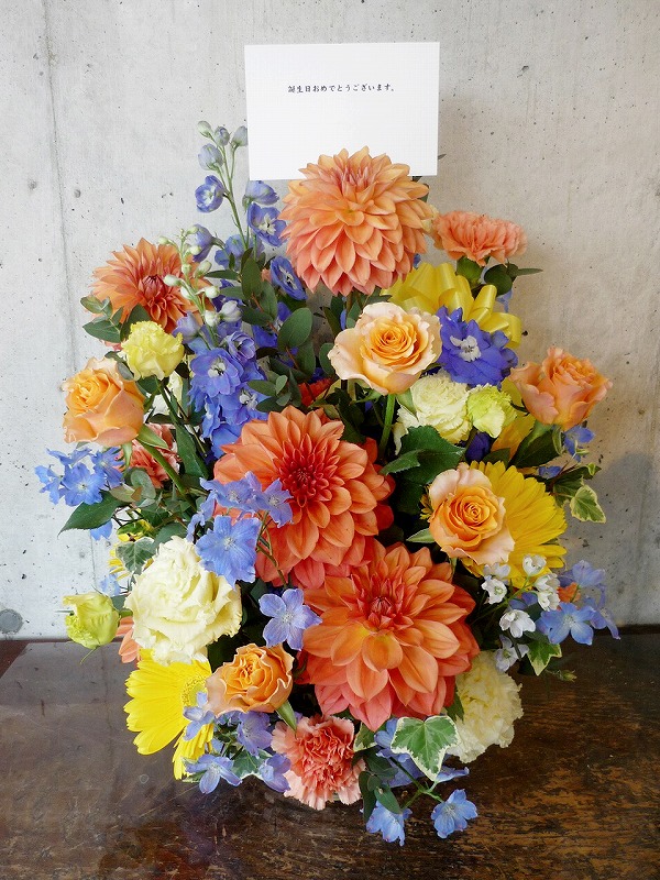 | ボリュームがあって豪勢なアレンジをお祝いに。 | 色とりどりの花のスタンドでお祝いの気持ちを。 |