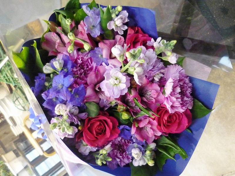 | プレゼントする人の雰囲気に合わせた美しい花々。 | シックな印象のある色使いは、飾る場所を選びません。 |
