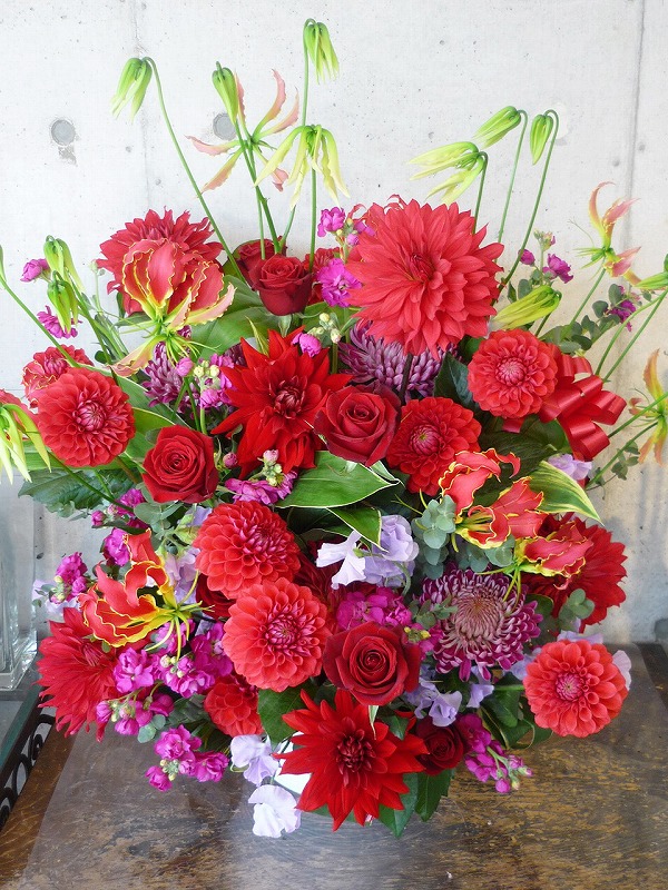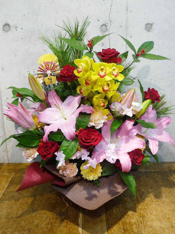 | お祝いの言葉と共に、たくさんの花々を。 | ボリュームがあって、豪勢なアレンジでお祝いを。 |