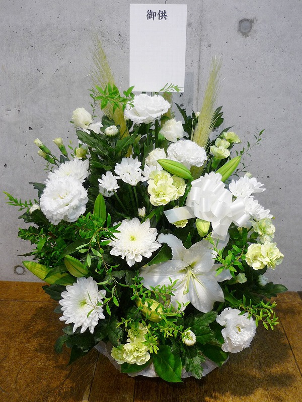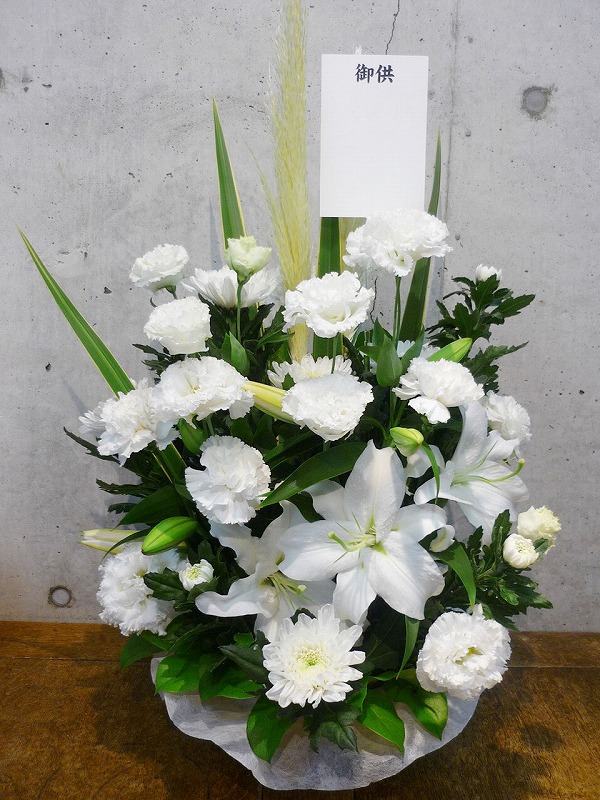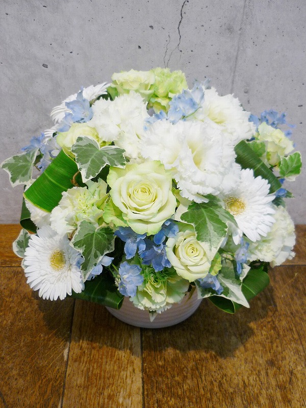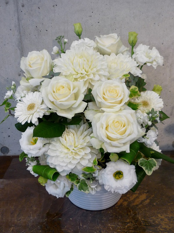| シックな印象のある色使いは、飾る場所を選びません。 | 品のある清楚な白い花々で故人を偲んで。 |