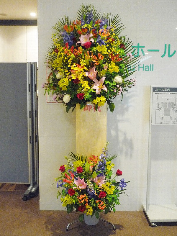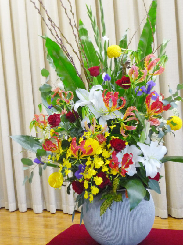 | ボリュームがあって豪勢なアレンジをお祝いに。 | 壇上で威風堂々、美しく映える色鮮やかな花々。 |
