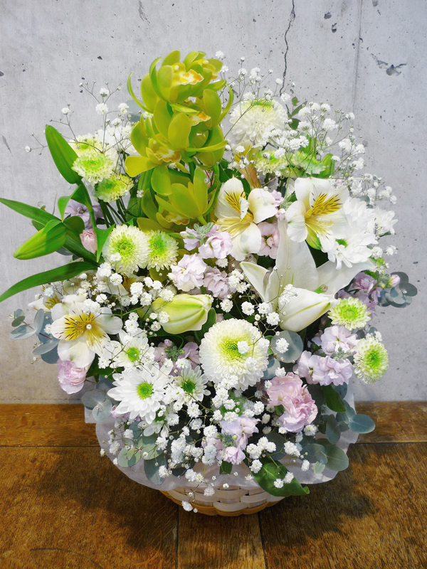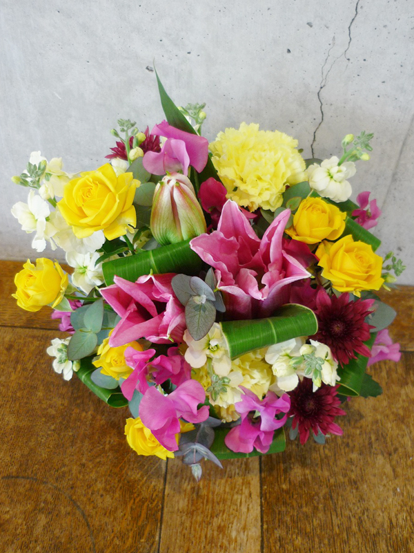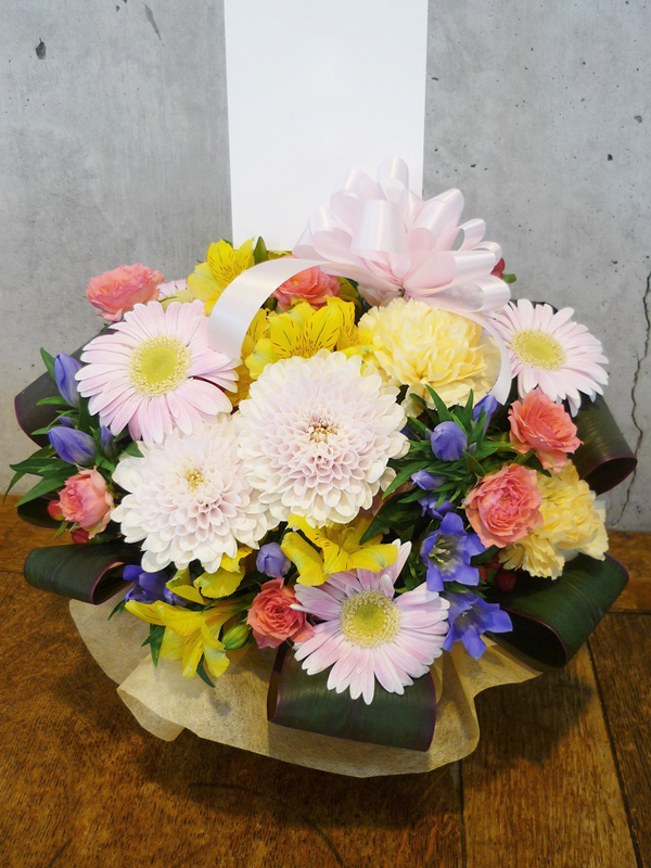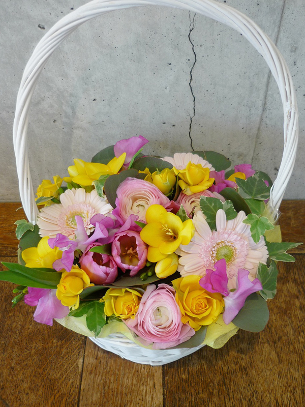 | 花かごに入った可愛らしい花々を想いと共に贈ります。 | プレゼントする人の雰囲気に合わせた明るい花々。 |