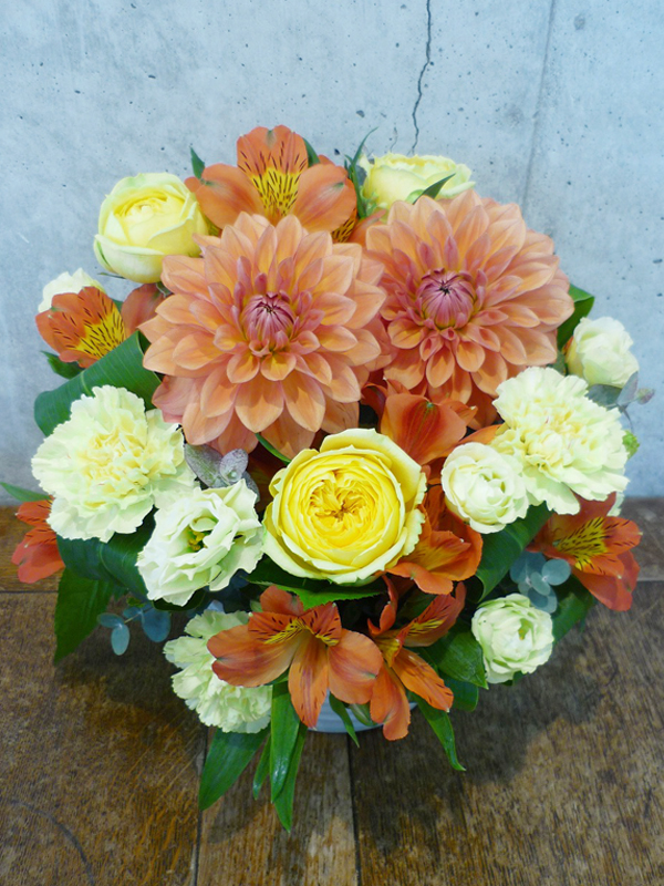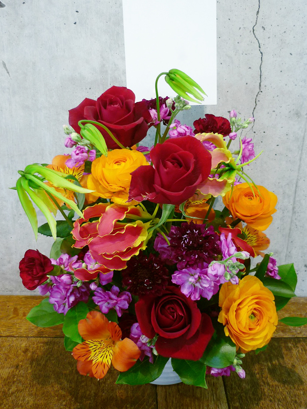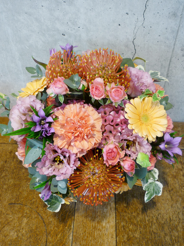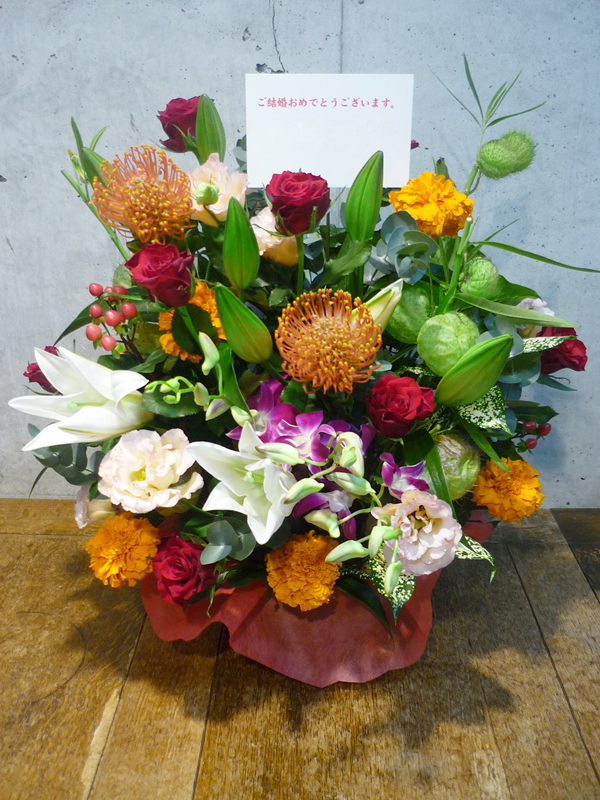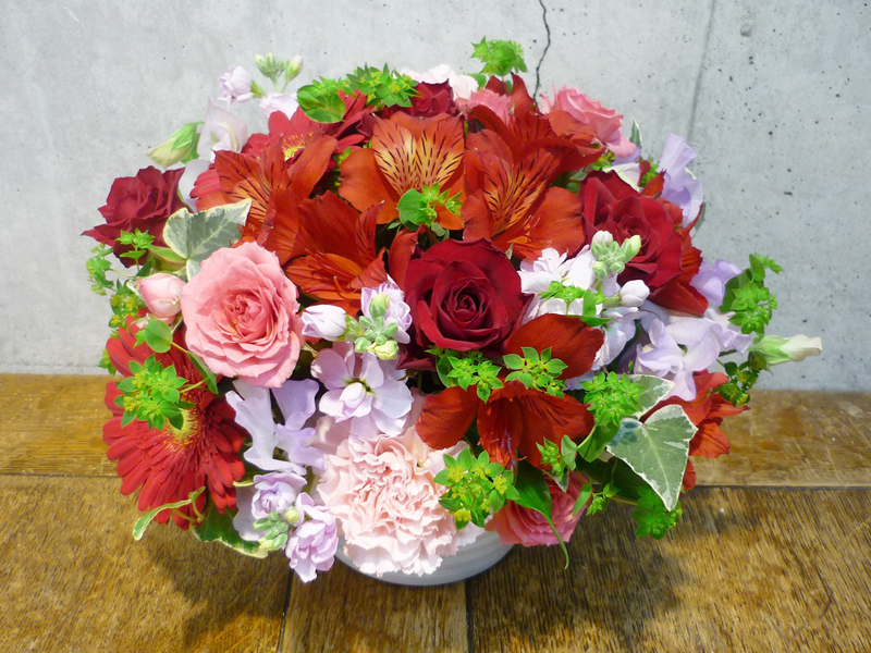 | 鮮やかな色の花々で空間を華やかに彩ります。 | シックな印象のある色使いは、飾る場所を選びません。 |