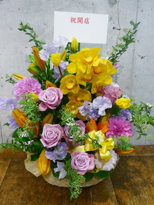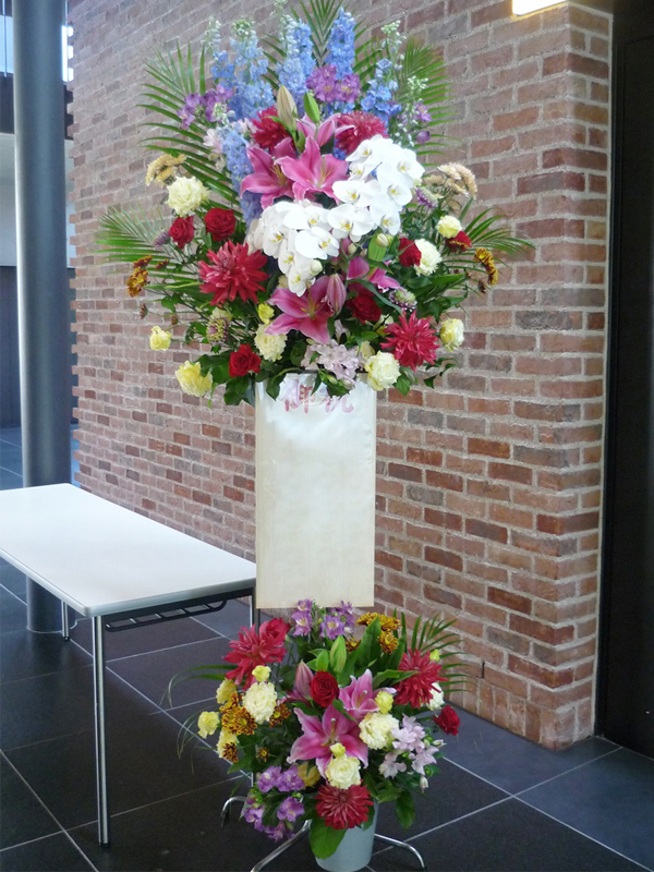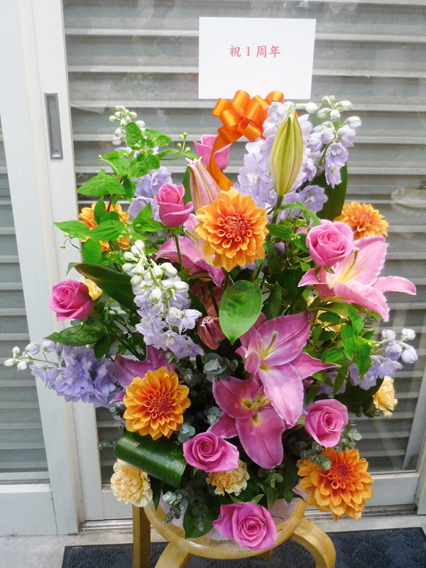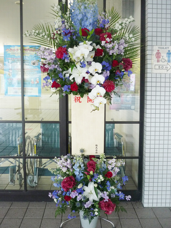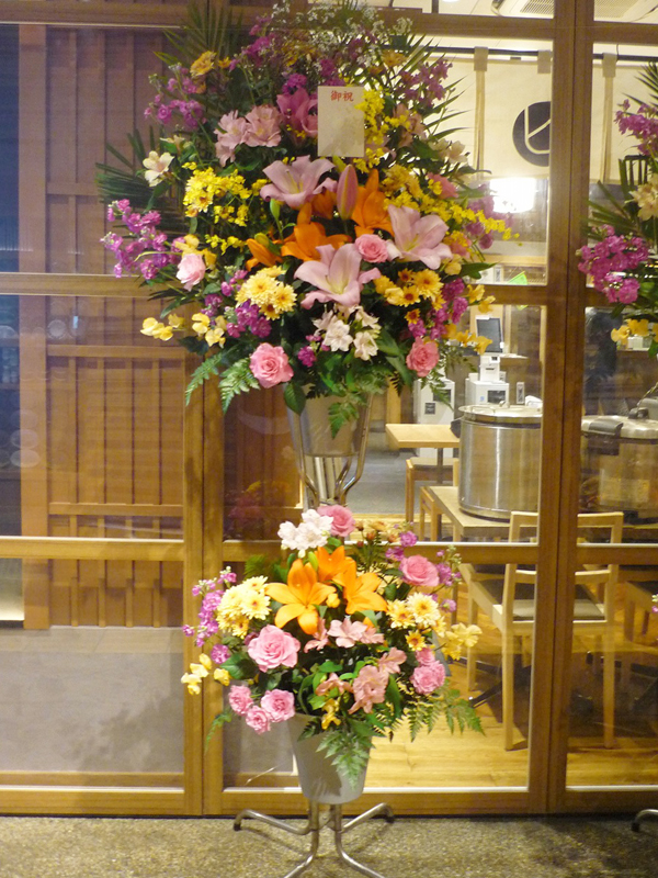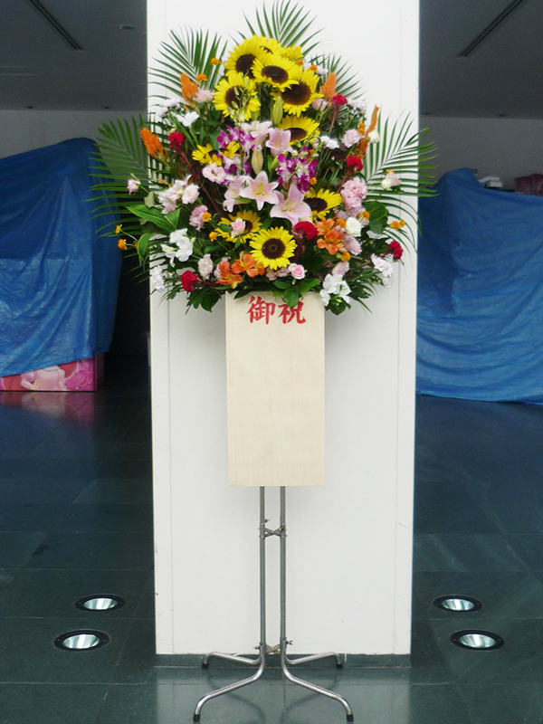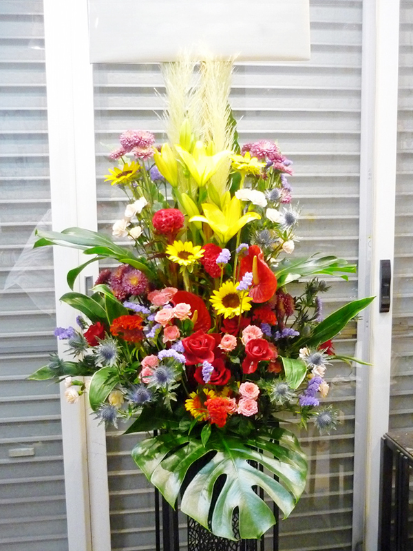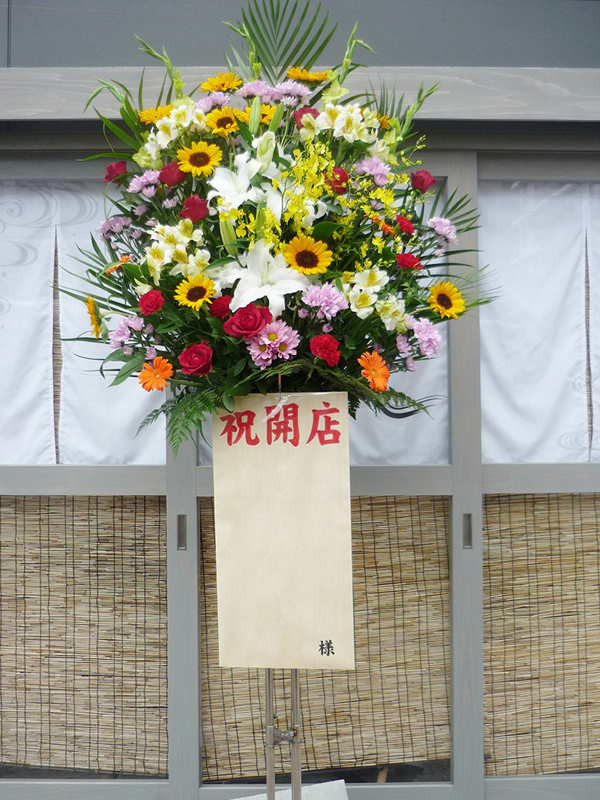 | 開店のお祝いに、美しいお花とお祝いの気持ちを込めて。 | 色とりどりの花のスタンドでお祝いの気持ちを。 |