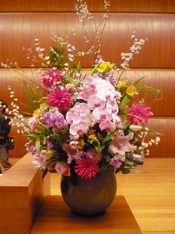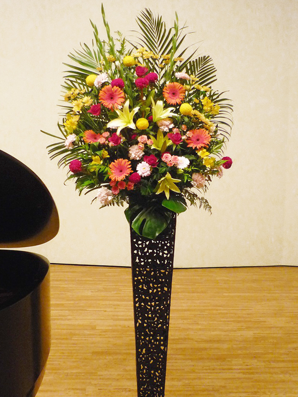 | 壇上でもひときわ目立つ美しい花々。 | 色とりどりの花のスタンドでお祝いの気持ちを。 |