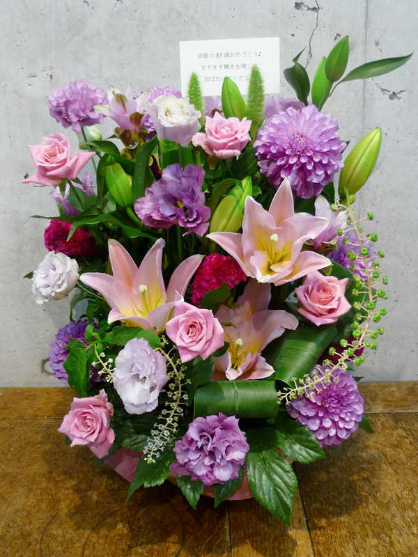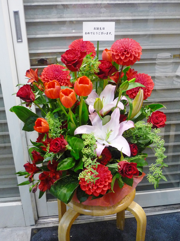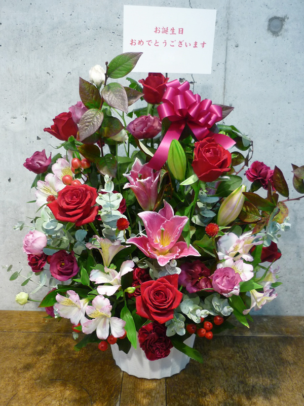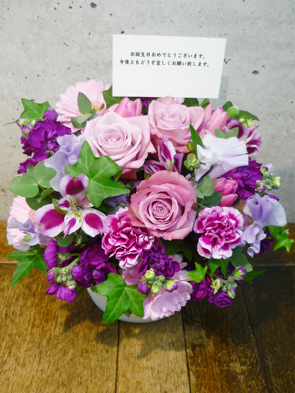 | お祝いの言葉と共に、たくさんの花々を。 | ボリュームがあって、豪勢なアレンジで誕生日のお祝いを。 |