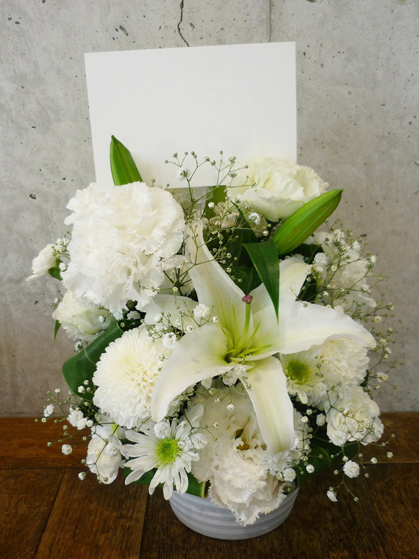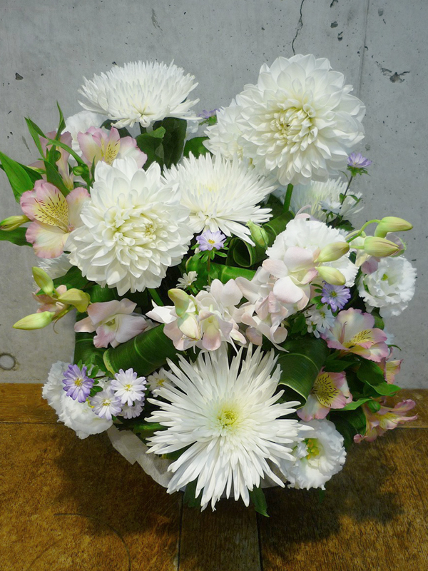 | 暑い夏にはヒマワリを使ったアレンジがよく似合います。 | 品のある清楚な白い花々で故人を偲んで。 |