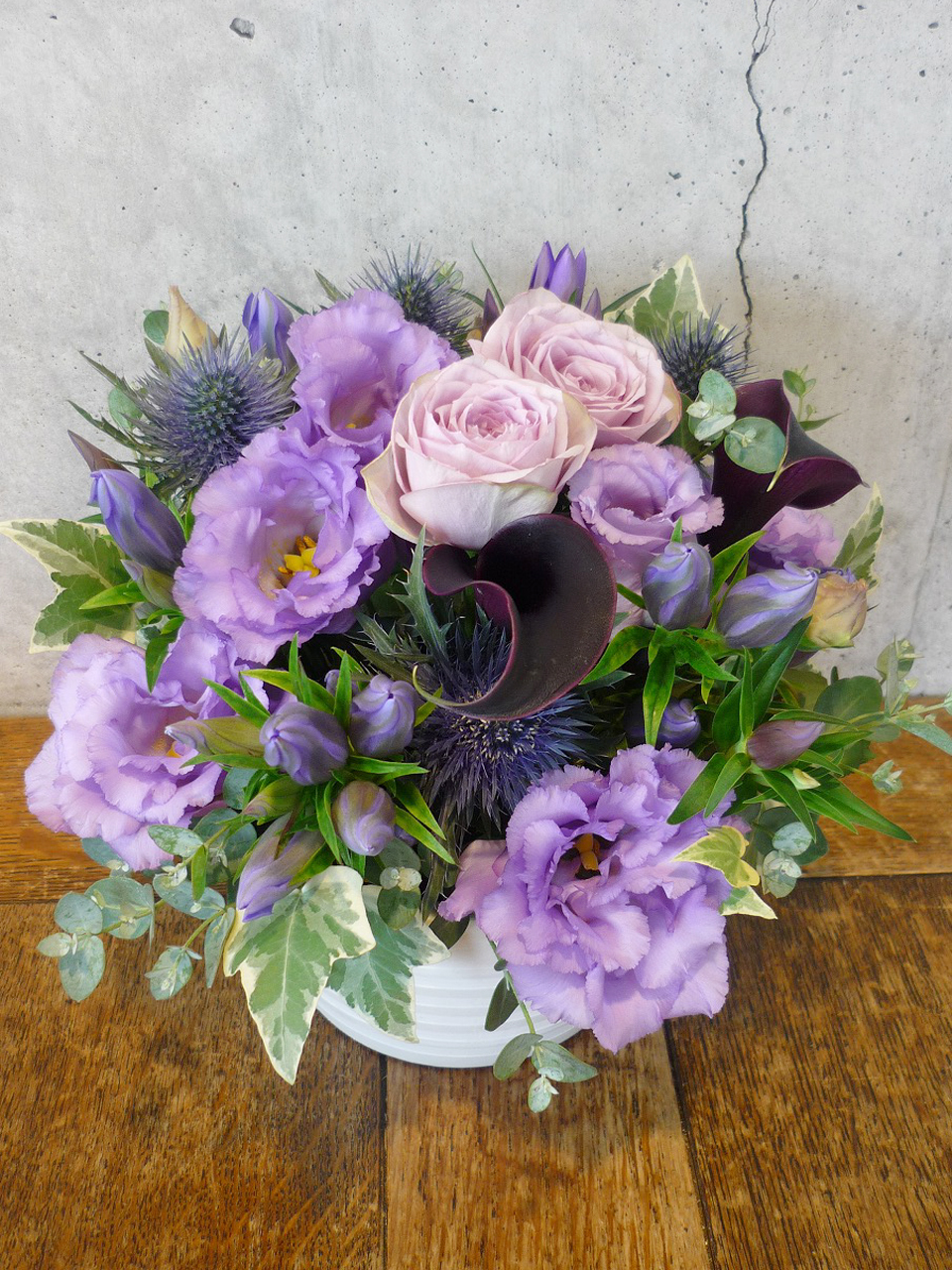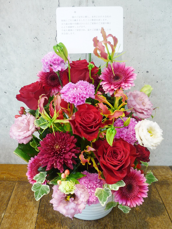 | プレゼントする人の雰囲気に合わせた美しい花々。 | シックな印象のある色使いは、飾る場所を選びません。 |
